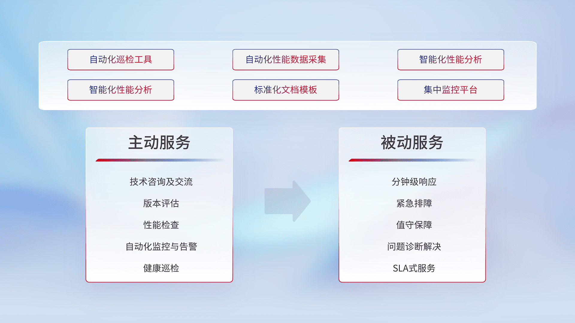智能化工具和标准化文档,,,保障服务质量,,,,提供主动服务(包含技术咨询、、、、版本评估、、性能检查、、、、自动化监控与告警、、、、健康巡检)和被动服务包含(分钟级响应、、紧急排障、、值守保障、、、、问题诊断解决、、、、SLA服务)。。。